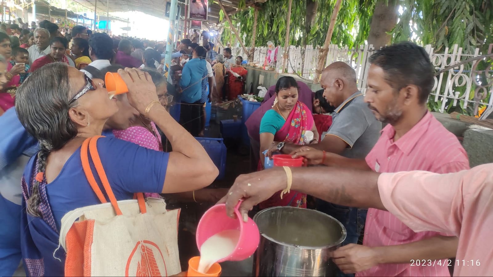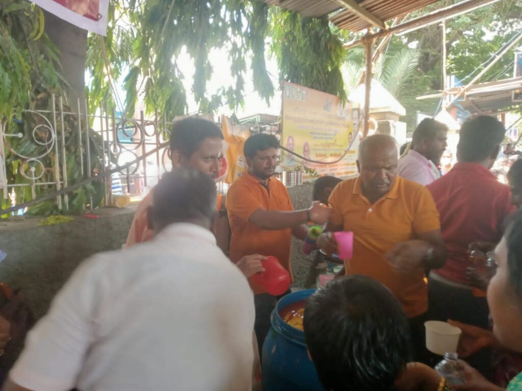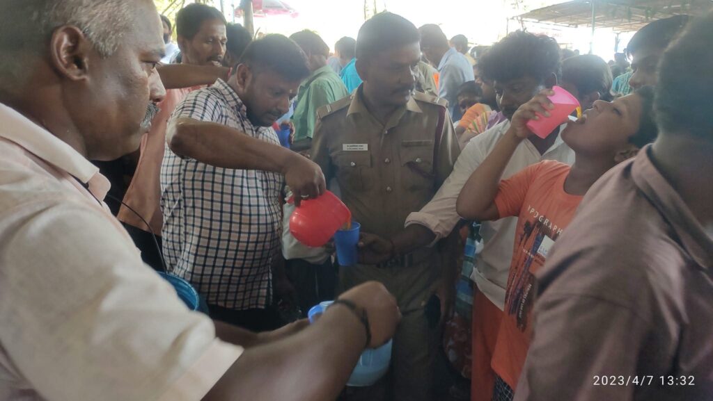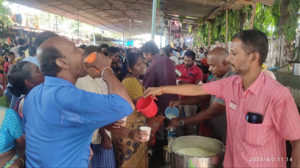 02/04/2023 நமது சர்வேஸ்வரா ட்ரஸ்ட் சார்பாக ஈரோடு அருள்மிகு பெரிய மாரியம்மன் கோவிலில் கம்பத்திற்கு மஞ்சள் நீர் ஊற்றவரும் பக்தர்களுக்கு நீர் மோர் வழங்கப்பட்டது.